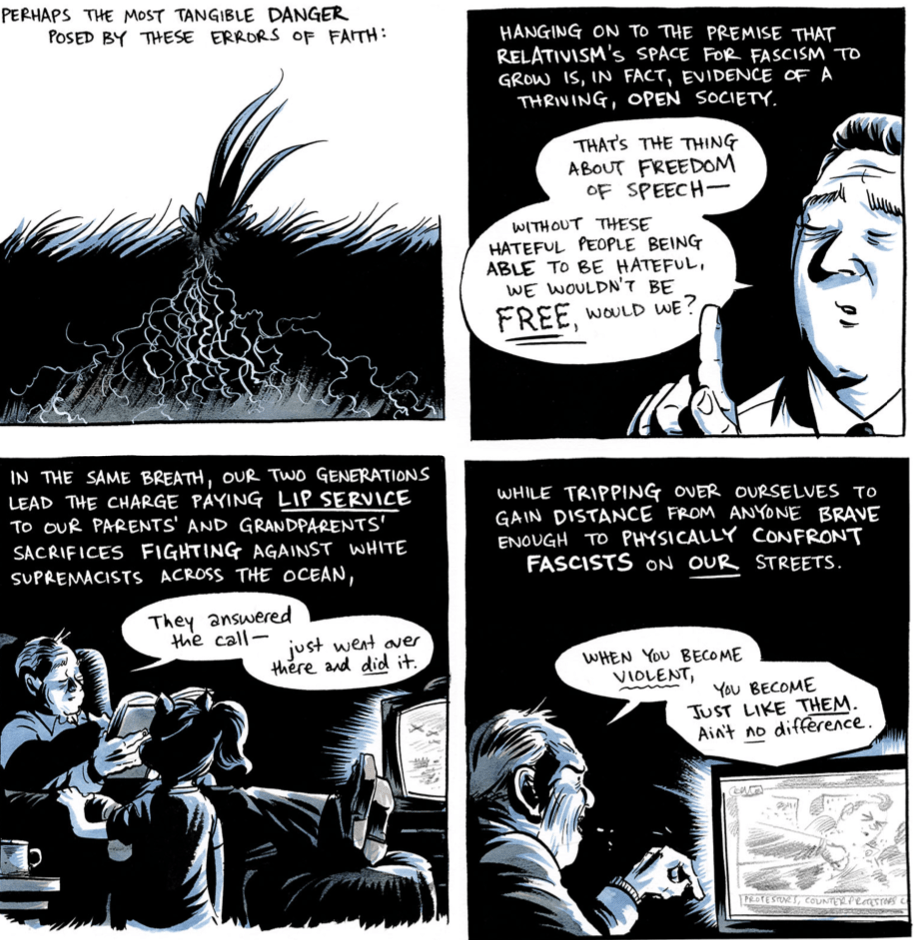 Powell begins to break down “most tangible danger posed by these errors of faith.” In this panel, Powell presents a dissection of a weed sprouting from the ground as its roots seep deep into the soil. He follows this up with three depicting different dangers. In the first, he shows what looks like a politician arguing that freedom of speech covers hate speech, and he narrates, “Hanging on the premise that relativism’s space for fascism to grow is, in fact, evidence of a thriving, open society.” This, of course, is not the case. How can one support hate speech, even under the guise of a healthy democracy, and not see the dangers it imposes? The ways it seeps into the soil? The ways it pollinates and expands?