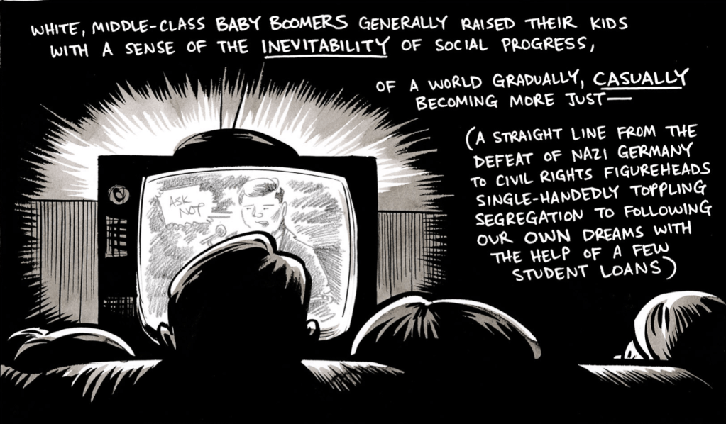 In one panel, Powell and his parents watch a clip of John F. Kennedy’s inaugural address where he said, “Ask not what your country can do for you – ask what you can do for your country.” These lines, of course, stir within us a sense of civil action, a desire to serve and create the ideal society that lies, in many ways, at the heart of the United States. However, the speech gets undercut with Powell’s narration. He says, “White, middle-class Baby Boomers generally raised their kids with a sense of the inevitability of social progress, of a world gradually, casually becoming more just–(A straight line from the defeat of Nazi Germany to Civil Rights figureheads single-handedly toppling segregation to following our own dreams with the help of a few student loans).”