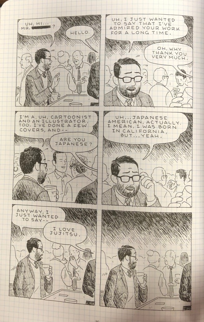 While individuals mispronouncing Tomine’s last name appear throughout the text, the moment at the New Yorker party highlights the spaces in between the hyphen that I’ve discussed before. At the party, Tomine sees one of his idols, and he makes his way over to the man. Tomine never depicts the man, we just get the man’s words from off the panel. This move highlights that the man can be anyone, anywhere, at any time. When they start to talk, Tomine tells the man he has done a few covers and illustrations for the magazine, then the man asks, “Are you Japanese.” Tomine touches his glasses, perhaps a call back to Gross’ question, and replies, “Uh . . . Japanese American actually. I mean I was born in California, but . . . yeah.” Tomine continues by trying to tell the man something, and the man merely says, “I love Jujitsu.” The final panel depicts Tomine, glass in hand, flabbergasted at the response.