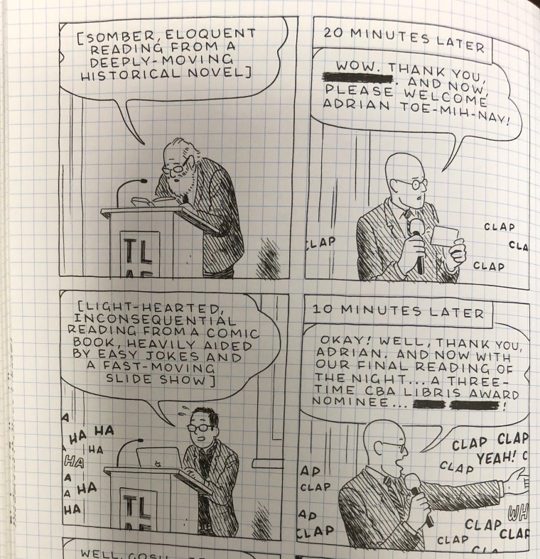 This occurs, most notably, in the various moments where individuals mispronounce his name. For me, people mispronounce my last name all of the time, so I didn’t think about it much. Our last name is probably pronounced like Deutsch, but over the centuries, it has become Americanized, and we pronounce it “Touch.” At the Literary Arts Festival in Toronto, the moderator mispronounces Tomine’s name twice. At the start, he welcomes everyone as lists off the three speakers, ending with “Adrian Toe-Meen.” The host looks at his card quizzically, struggling with how to pronounce Tomine’s last name. When Tomine goes up to the stage, he tells the crowd, “And now, please welcome Adrian Toe-Mih-Nay.” Here, he pronounces Tomine’s name differently from the first time, highlighting his lack of even trying to learn how to pronounce Tomine’s name correctly.