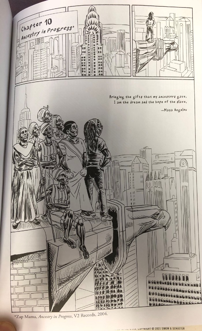 Hall, overlooking New York, is the dream of the ancestors that stand behind her. She has told their stories. She has carried on their legacies. She has continued to move forward. And, she has honored their lives. Even though progression has occurred, the residual effects of slavery carry on to the core of the nation. The next panel, a two-page spread, highlights this very fact. The spread shows Hall, at the bottom right, walking through an empty Grand Central Station as she narrates, “We are haunted. Haunted by slavery and its legacy. Our country lives in the afterlife of slavery.”