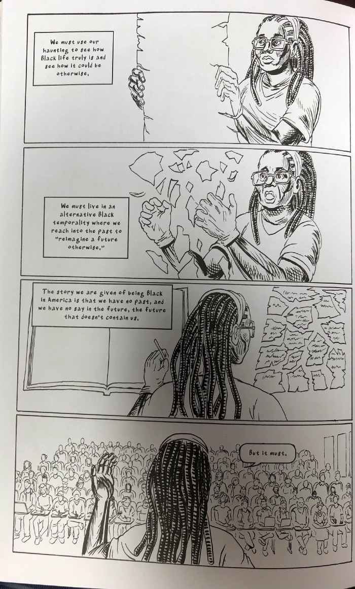 These things linger within our collective psyche, pulling and tugging at us. The haunting of the past causes trauma, as Hall points out throughout the text. Near the end of the chapter, Hall holds an archival manuscript within her hands and narrates, “We must use our haunting to see how Black life truly is and see how it could be otherwise.” In the next panel, the manuscript crumbles in her grasp, and she narrates, “We must live in an alternative Black temporality where we reach into the past to ‘reimagine the future otherwise.’” The third panel depicts Hall piecing the manuscript back together as she says, “the story we are given of being Black in America is that we have no past, and we have no say in the future, the future that doesn’t contain us.”