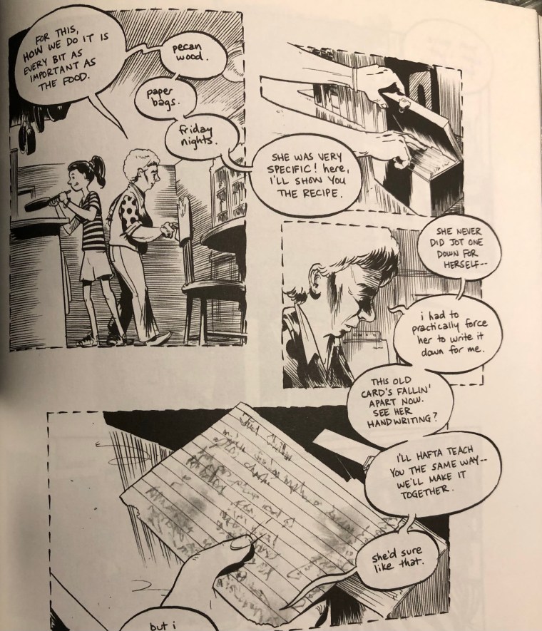 This connection of generations through recipes, the passing down of stories, and the tangible material objects of the past is what Nate Powell’s “Conjurers” deals with. The story links three generations together over a recipe, and as Powell puts it, “Sometimes it seems that the act of re-creating a recipe of the deceased is a magic of sorts. It’s the closest we can come to summoning their distinct, intangible properties, and does seem to truly carry magical properties allowing us to transcend the limitations of our existence.” It serves as a tangible connection to our ancestors, whether we ever met them face to face or not. It connects us, across time and space, linking us in the ether through nostalgia, reminisces, memory, narrative, or more.