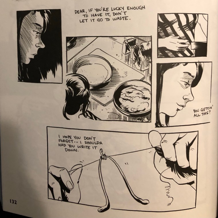 Each of these moments is interspersed with Rose and her mother preparing the chicken, Rose’s mother detailing the instructions to her daughter along the way. Rose asks her mother what will happen when they don’t need every part of the chicken, and her mother tells her, “Dear, if you’re lucky enough to have it, don’t let it go to waste.” At this moment, we see five panels depicting Rose’s great granddaughter in the present. She looks at the ingredients, and in one panel, she touches her stomach. The following panel shows the woman’s face as she asks, “You gettin’ all this?” This question can be taken in two ways.