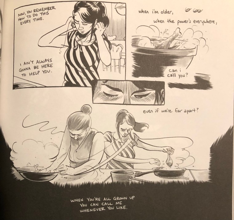 When we see the chicken and flour in a bowl, we get a question: “When I’m older, when the power’s everywhere, can I call you?” Here, we know that this is Rose speaking. The power lines are approaching her house, and she asks her mother if they she can call if she needs help with the recipe or anything else. With this knowledge, we move back to the previous panel and begin to see that the two lines there, while emanating from the woman’s grandmother, also emanate from Rose’s mother, again linking the generations. This becomes clear in the next two panels, a closeup of the woman’s eyes and a panel showing the woman, on the right, cooking, and her great-great grandmother on the left doing the same as a question lingers on the panel: “Even if we’re far apart?”