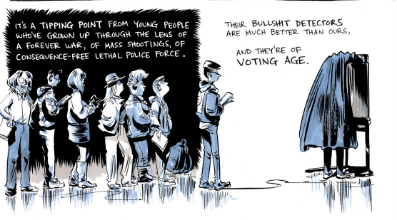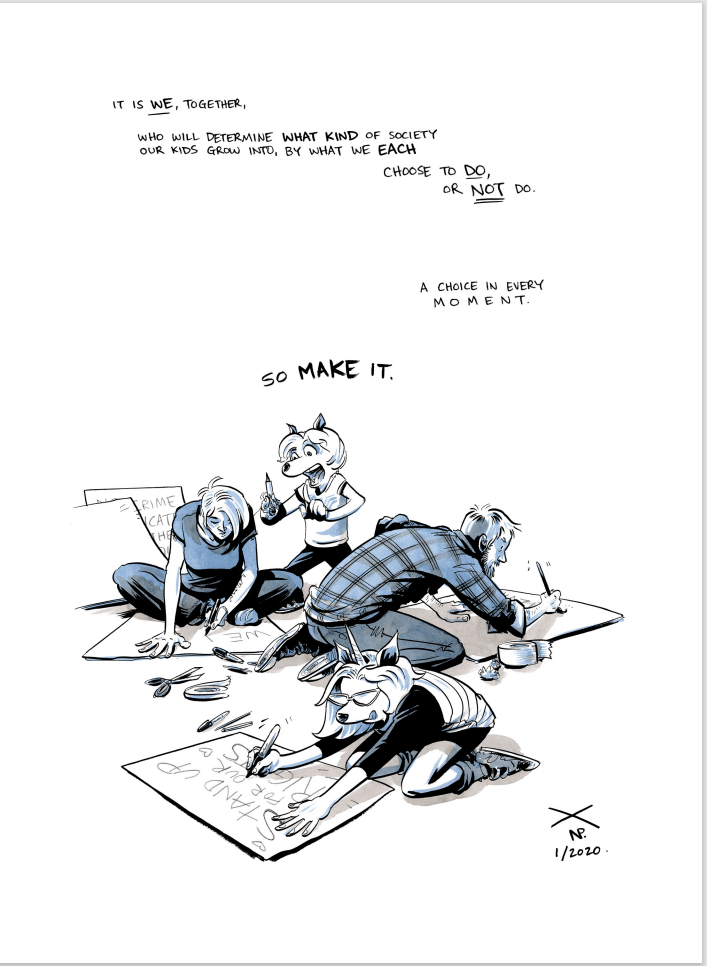 After Powell asks us what we will risk and what consequences we’re willing to accept as part of that risk, he concludes the book with a final full-page panel. The panel shows Powell, his wife, and his daughter’s making signs for a march, and he narrates, “It is we, together, who will determine what kind of society our kids grow into, by what we each choose to do, or not do. A choice in every moment. So make it.” We all control the future and the society that we create for our kids. We all provide the nourishment for the seeds contained within each child. What nourishment will we provide? What sunlight will give it? How much water will we use? What actions will we take?