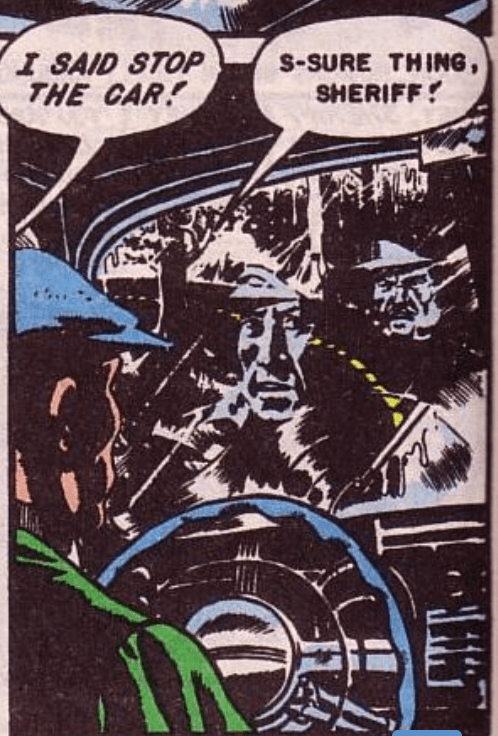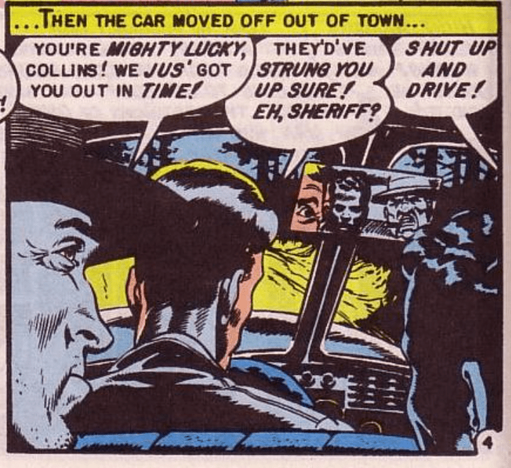 The next panel shows the sheriff and some of his men driving Collins to the new location for protection. As the car leaves town, we see inside the vehicle. We are in the backseat, looking over the driver’s shoulder. We also see the driver’s eyes and Collins’ and sheriff Dawson’s reflections in the rearview mirror. The reader is Collins, staring at the driver, the road ahead, and at his own reflection in the mirror as the men tell Collins how luck he is to have gotten out of the situation alive. The panel positions the reader as Collins, not through the narrative but through the illustration. In this manner, as Feldstein and Wood do elsewhere in “The Guilty!” the reader sees through Collins’ eyes, viscerally experiencing, in a small way, what he experiences.