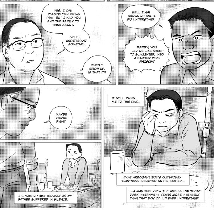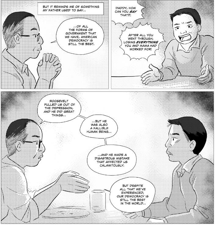 At the end of the memoir, after Takei mentions Ronald Regan and the reparations and apology from the United States government, we see four final images of the teenage Takei and his father. In the first two, we again see a split with Takei’s father on the left, the gutter, then Takei on the right. Takei’s father, hands clasped just below his chin, tells his son, “of all the forms of government that we have, American democracy is still the best.” Across the gutter, Takei again screams at his father, asking, “Daddy, how can you say that?! After all you went through. Losing everything you and mama had worked for!” Here, Takei does not fully understand why his father still feels that way that he does, especially in the face of the United States’ treatment of him and his family. We see, as well, the divide that still exists between them. This divide, though, gets overcome in the next panel.