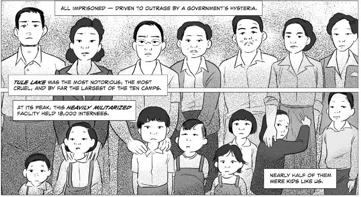 Along with these moments, one other illustration stands out for this discussion. When Takei and his family get taken to Tule Lake, an illustration appears showing imprisoned individuals. At the top are parents and on the bottom children stand in front of their parents. The illustration has a gutter running through the middle, separating the parents from the children, even though we see the parents’ hands on some of the children’s shoulders. Here, Takei narrates, “Tule Lake was the most notorious, the most cruel, and by far the largest of the ten camps. At its peak, this heavily militarized facility held 18,000 internees. Nearly half of them were kids like us.” The illustration highlights the fact that half of those at Tule Lake were children, but it also serves to highlight the separation that Takei talks about with his father, the differences in their recollections of events.