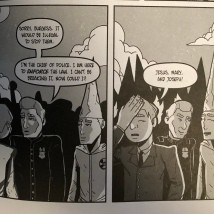 Again, we see this is The Day the Klan Came to Town. Most importantly, we see it in the use of the police force to further the Klan’s actions on “Karnegie Day.” When John Conley, the Burgess of Carnegie Borough, stops the Klan members from marching, Chief Keisling, the chief of police, allows them to continue. We see this moment in a four-panel page where a Klan member tells Conley that he’s infringing on their first amendment rights, and then the Klan member turns to the chief and asks him to agree. Keisling then tells Conley, “Sorry, Burgess, it would be illegal to stop them. I’m the chief of police. I am here to enforce the law. I can’t be breaking it, now could I?” The next panel shows Conley turning away in disgust. Behind him, Keisling winks and smiles at the Klan member, showing his role within the march, as a facilitator and as an insider working within the walls of the law, the police serving alongside the Klan in their goals.
