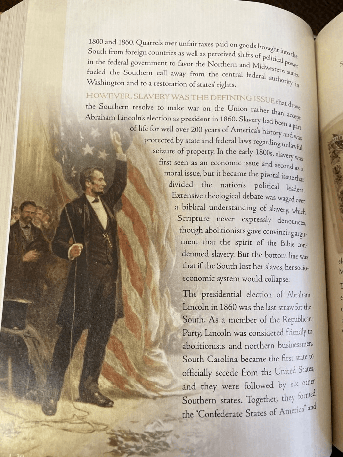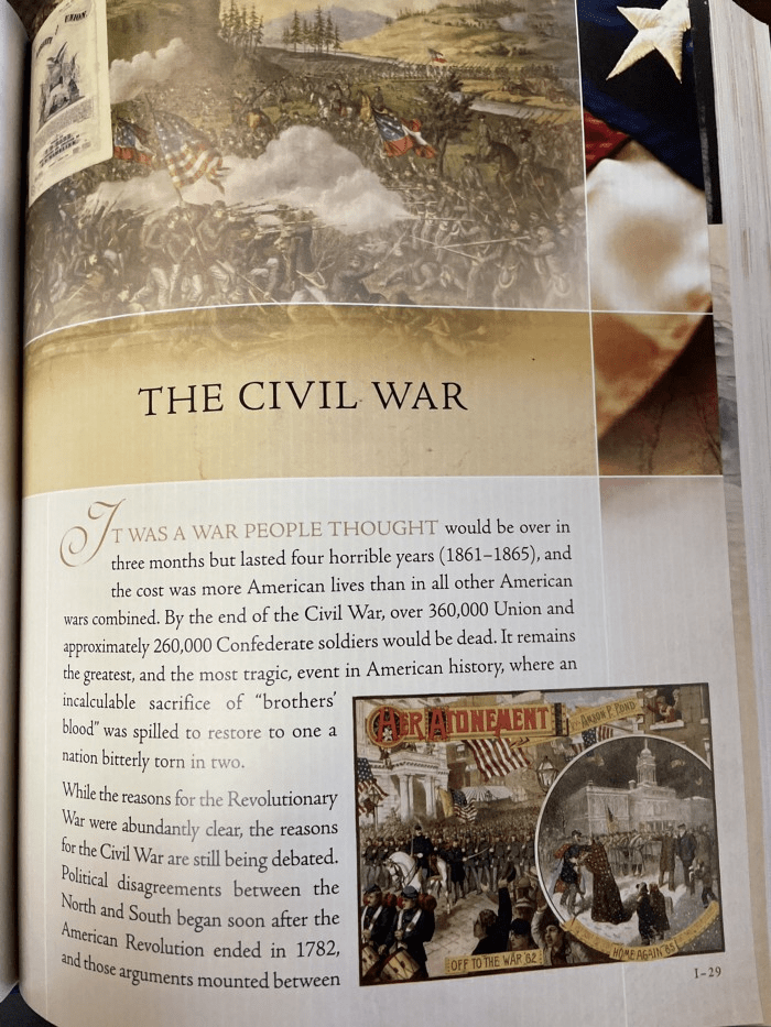 Today, I want to break down some of the rhetoric and imagery that the Patriot’s Bible uses when relating the events of the Civil War. The section begins, not with any mention of slavery. Rather, it opens with a paragraph discussing that many people thought it “would be over in three months but lasted four horrible years,” pitting brother against brother and resulting in the deaths of over 620,000 soldiers. The section then moves on to state, “While the reasons for the Revolutionary War were abundantly clear, the reasons for the Civil War are still being debated.” Again, no mention of slavery. Instead, we see a discussion of “political disagreements” arising between the South and the North following the Revolution in 1782.