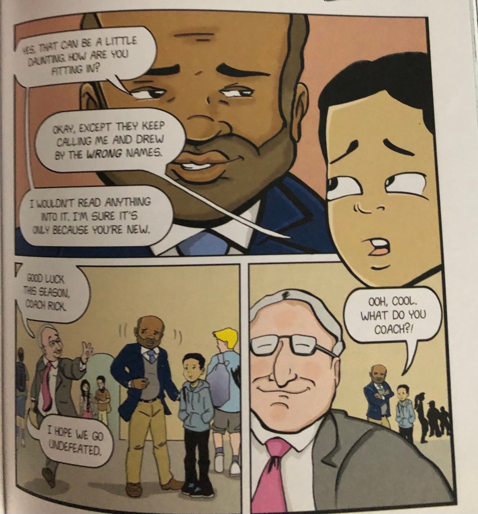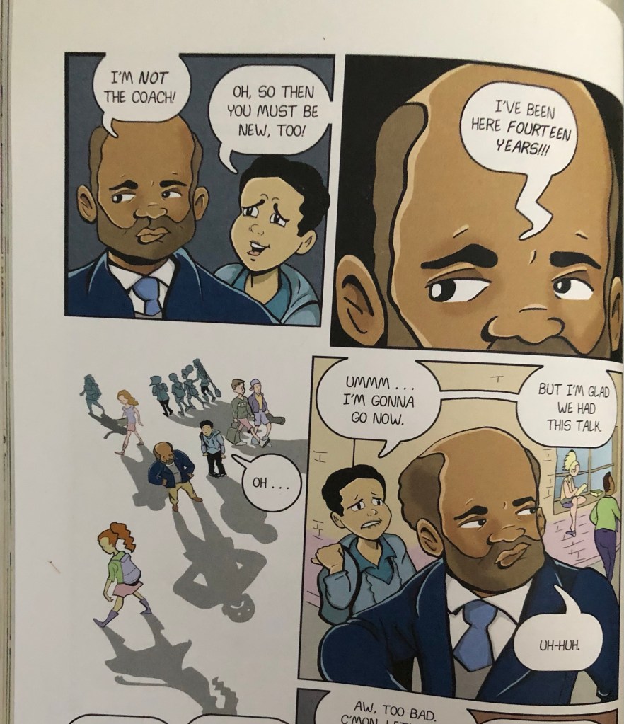 The final panel on the page shows the white faculty member walking away from Jordan and Mr. Garner. He has a smile on his face, oblivious to what he has just done. We see Mr. Garner in the background, arms crossed, staring at the faculty member, as Jordan asks him what he coaches. Mr. Garner tells Jordan that he doesn’t coach anything, and Jordan assumes, then, that Mr. Gardner must be, like himself, new. Mr. Garner responds, “I’ve been here fourteen years!!!”
