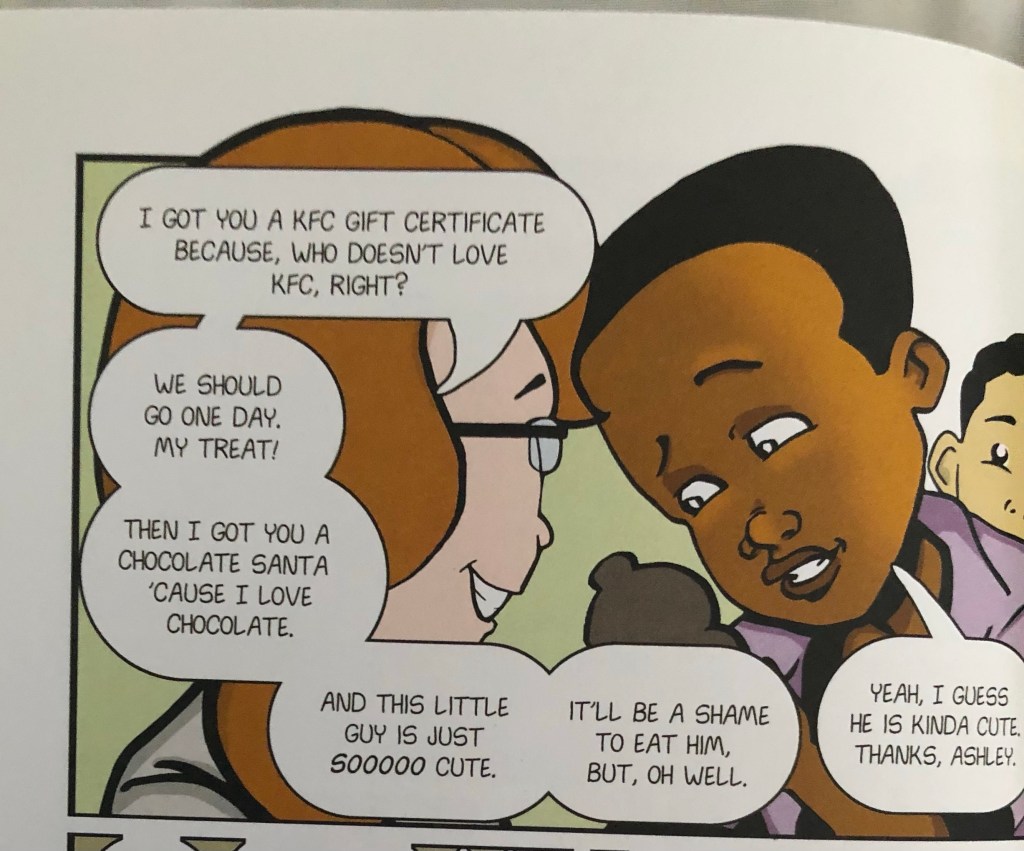 The above example is a pretty obvious moment where we see ontological expansiveness; however, there are other moments where its presentation isn’t so obvious. One of these occurs during the secret Santa exchange. This sequence is where Flowers introduced me to ontological expansiveness. Here, Ashely, a white female student, is Drew’s secret Santa. The sequence begins with Drew showing Jordan the three gifts he received from his secret Santa: a plate full of basketball shaped cookies, a gift certificate to KFC, and a chocolate Santa. With each gift, Drew feels as if the secret Santa is being racist, playing into stereotypes.