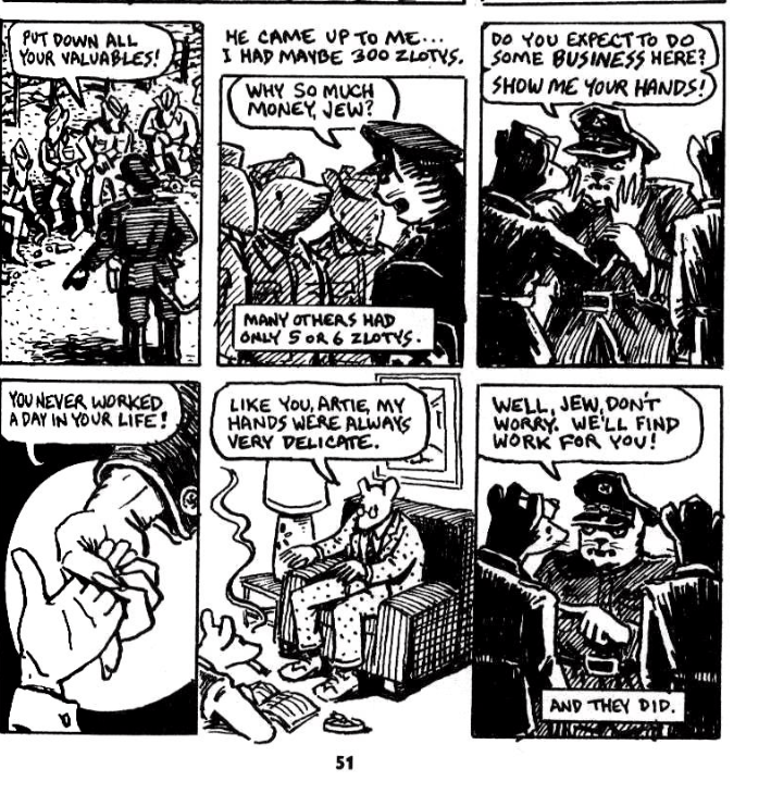 We don’t see the execution, but we know the end. What we do see is the complicity of the soldiers, the downward spiral into oblivion and hatred. They know that they won’t get punished. They know that they may receive praise. They know that there will be no retribution from anyone for their murderous actions. They have climbed another rung towards the acceptance of gas chambers and crematoriums. They are not Hitler. They are not Himmler. They are not . . . We do not know their names. We do not know their stories. We do know they became lulled to sleep, allowing themselves to receive water to help the seeds of hatred grow within them. We know all of this, and Spiegelman shows us this by focusing on them, not on Hitler or others.