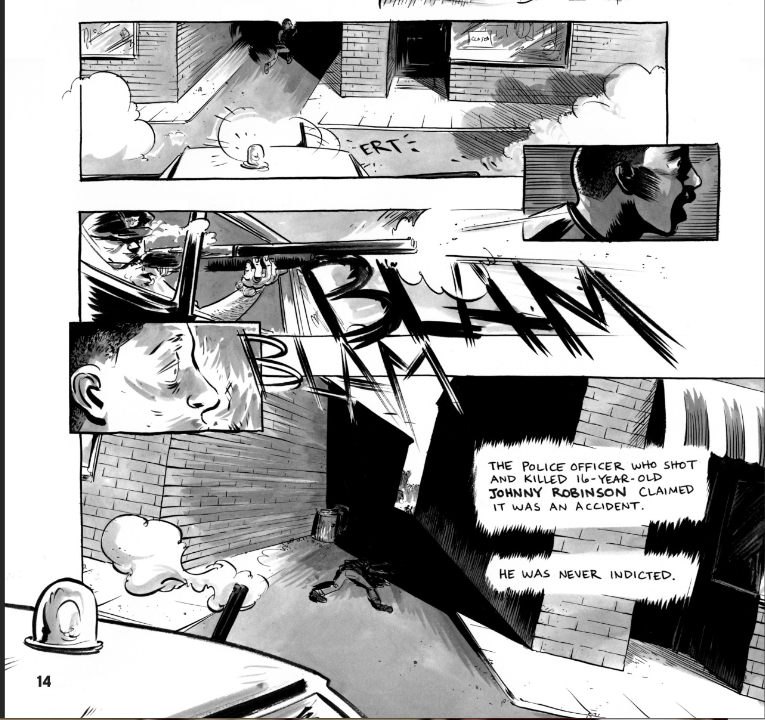 Along with panels and layouts, Aydin and Powell also talked the historical information included in March and the decisions surrounding what to incorporate and how. This part of the conversation really interested me, notably their comments about the depiction of Jimmie Lee Jackson’s and Johnny Robinson’s murders because of the lack of eyewitness and on the record, legal accounts of the incidents. In Robinson’s murder, Powell noted that we know the sequence of events; however, the survivor’s eyewitness testimony contains a grey area in relation to the number of times the officer shot: once or twice. To offshoot this, Powell altered the lettering of the second shotgun blast, and in this manner, it can be read as an echo or a second shot.