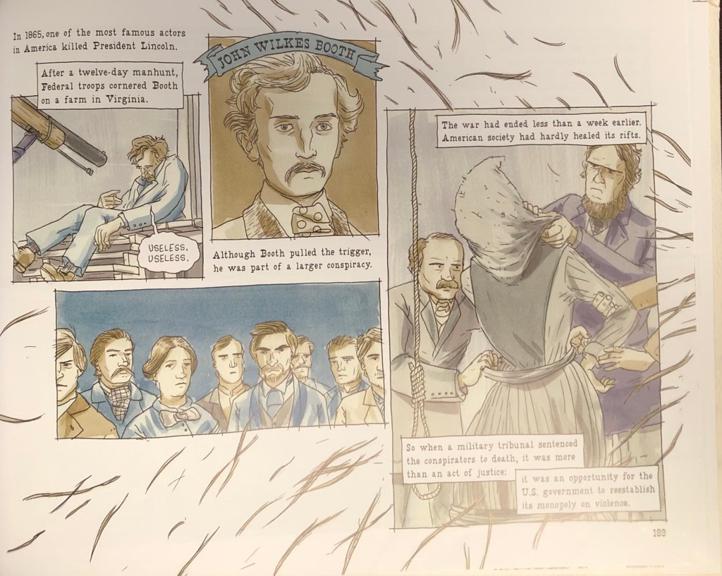 On the first page of “Nooses,” following the newspaper, we see four panels showing the killing of John Wilkes Booth, a portrait of Booth, a crowd wathcing an execution, and a large panel showing officials getting one of the conspirators ready for execution by hanging. We see the noose in the final panel as a man places a hood over the conspirator’s head. Behind these panels we see fibers flowing, as if in the wind, loose and unorganized. We can tell they flow from the right side of the page, and when we turn the page, we see the fibers joining together, running the across the middle of the two pages, forming into a strand that will become, on the subsequent pages, part of a rope.