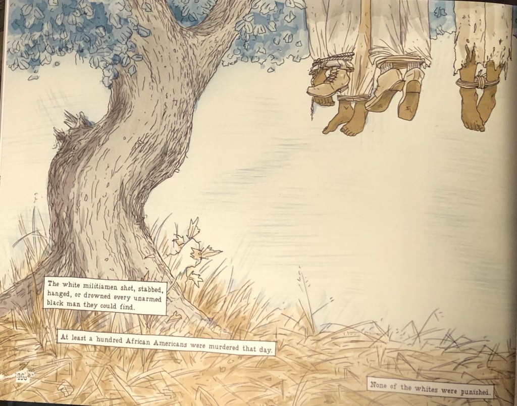 “Nooses” ends with a full-page panel where we see the trunk of a tree and the feet of four African American individuals, their feet tied with ropes, hanging from the branches. The narration details how many people the whites murdered, and the final narration states, “None of the whites were punished.” A historical marker stood in Colfax till last year, and it privileged the three white men who died during the massacre, concluding with the phrase that the “riot” “marked the end of carpetbag misrule in the South.” Another monument in the town cemetery, dedicated to the three white men, reads that the men died “fighting for white supremacy.” That obelisk was erected in 1921.