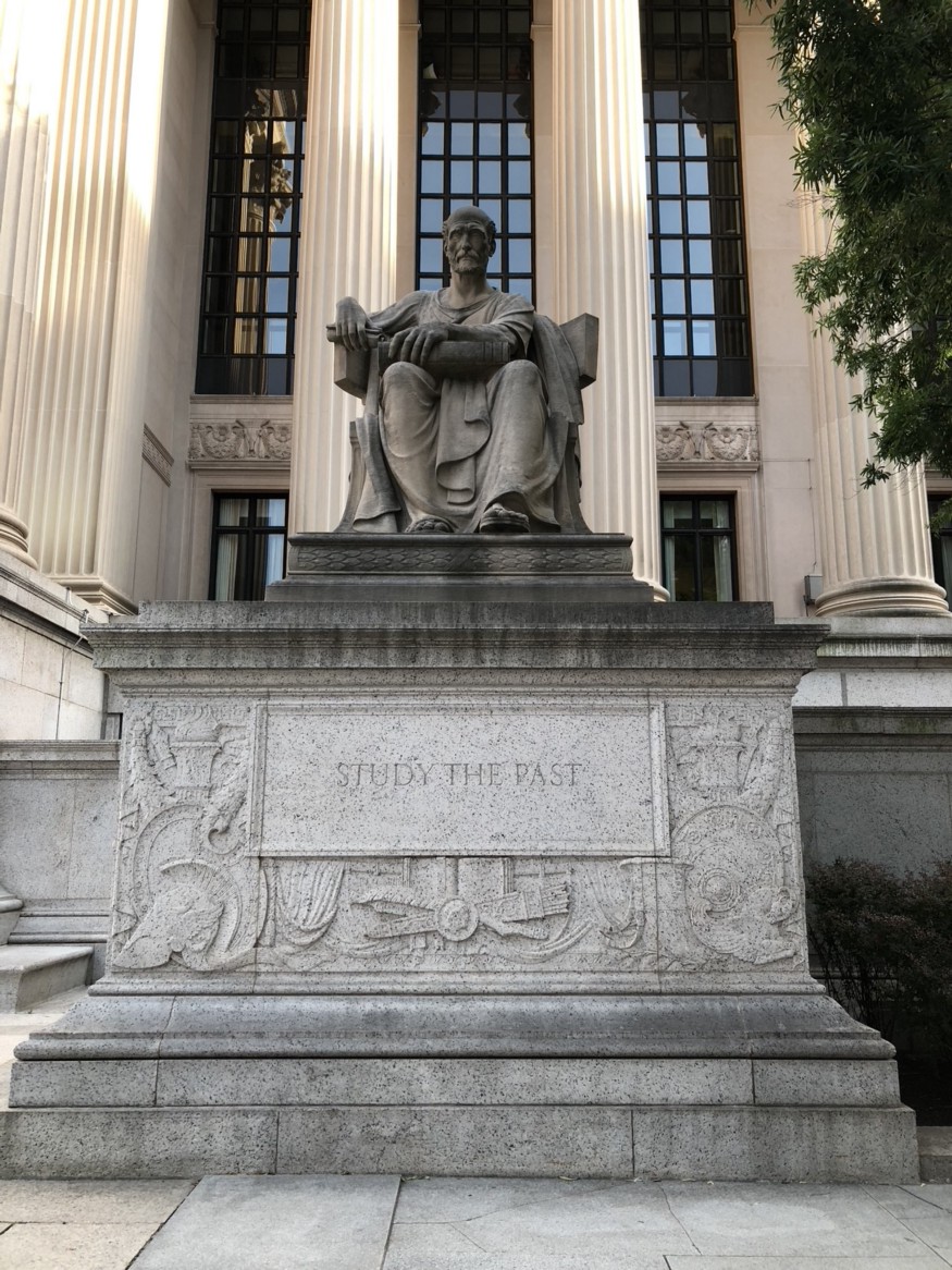 Every space in Washington D.C. reminds you of the importance of history in informing our present and our future. This is especially true at the National Archives, the site of the Deceleration of Independence, the Constitution, the Bill of Rights, and other important documents from our nation’s history. Four statues rest outside of the National Archives, two on the north entrance and two on the south. Each of these statues comment on the importance of remembering the past and making it, as Douglass put said, “useful to the present and to the future.”