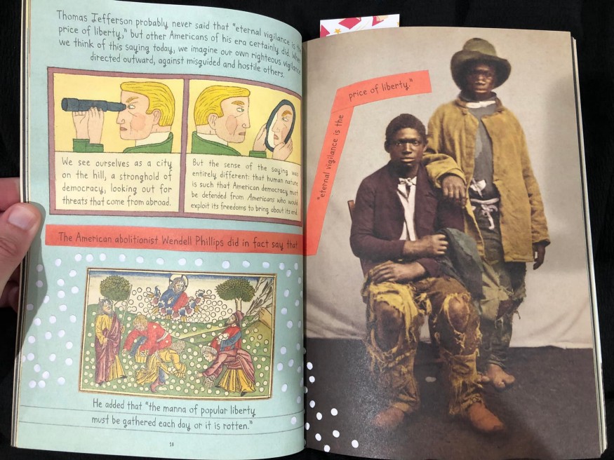 Snyder and Krug continue by having a full page image of two enslaved individuals with the phrase, as uttered by the abolitionist Wendel Phillips. wrapping around them. This framing points to the fact that we must be ever vigilante about those who wish to deny the “pursuit of life, liberty and happiness” for all. Enslavers and those who supported enslavement did this during slavery. We see similar things today with anti-abortion laws and rhetoric where the “liberty” of a certain group trumps the liberties of others. We see it with Christian fascism and its desire to impose a theocracy, thus denying the rights of individuals who disagree. These threats are not external. They are internal, and they seek to, under the guise of democracy, limit the rights of individuals.