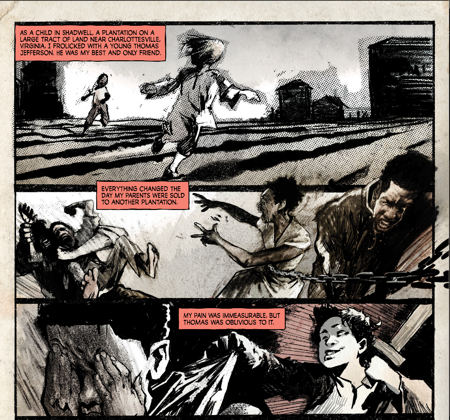 Along with the dialogue from Jefferson, the juxtaposing panels depicting Jefferson and Jupiter are important. As he describes their childhood “friendship,” we see a young Jupiter smiling as he pushes Jefferson on a swing. The next panel, where Jupiter learns his “station,” depicts a silhouette of Jefferson in the background swinging while in the foreground we see a white man, possibly an overseer, whipping the young Jupiter as his head hangs down. We move from “joyful” childhood “friendship” to separation, each moving into their “station” in life. Jefferson immediately follows this up by saying that Jupiter “hasn’t been the same since his family was sold off.” We don’t see this moment. Instead, we just see Jefferson telling this to Abigail. This shows Jefferson’s disregard for his “almost” friend and for those he and his family enslaved.