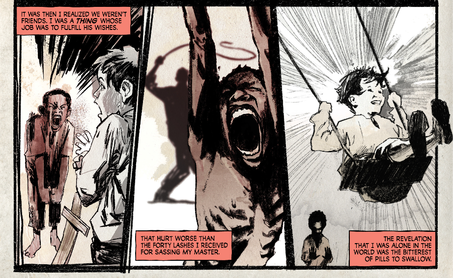 This image of Jupiter pushing Jefferson on the swing recurs later, as well, in Jupiter’s telling of his history. Whereas Jefferson, and by extension Abigail, depict Jupiter as joyful and happy playing with the young Jefferson, Jupiter depicts the events in a starkly different manner. This four-page sequence where Jupiter tells his own story begins similar to Jefferson’s telling. We see, in the first panel, Jupiter chasing Jefferson around Shadwell Plantation, and Jupiter says that Jefferson as his “best and only friend,” not his “almost” friend as Jefferson describes it.