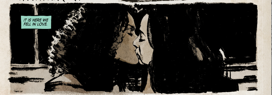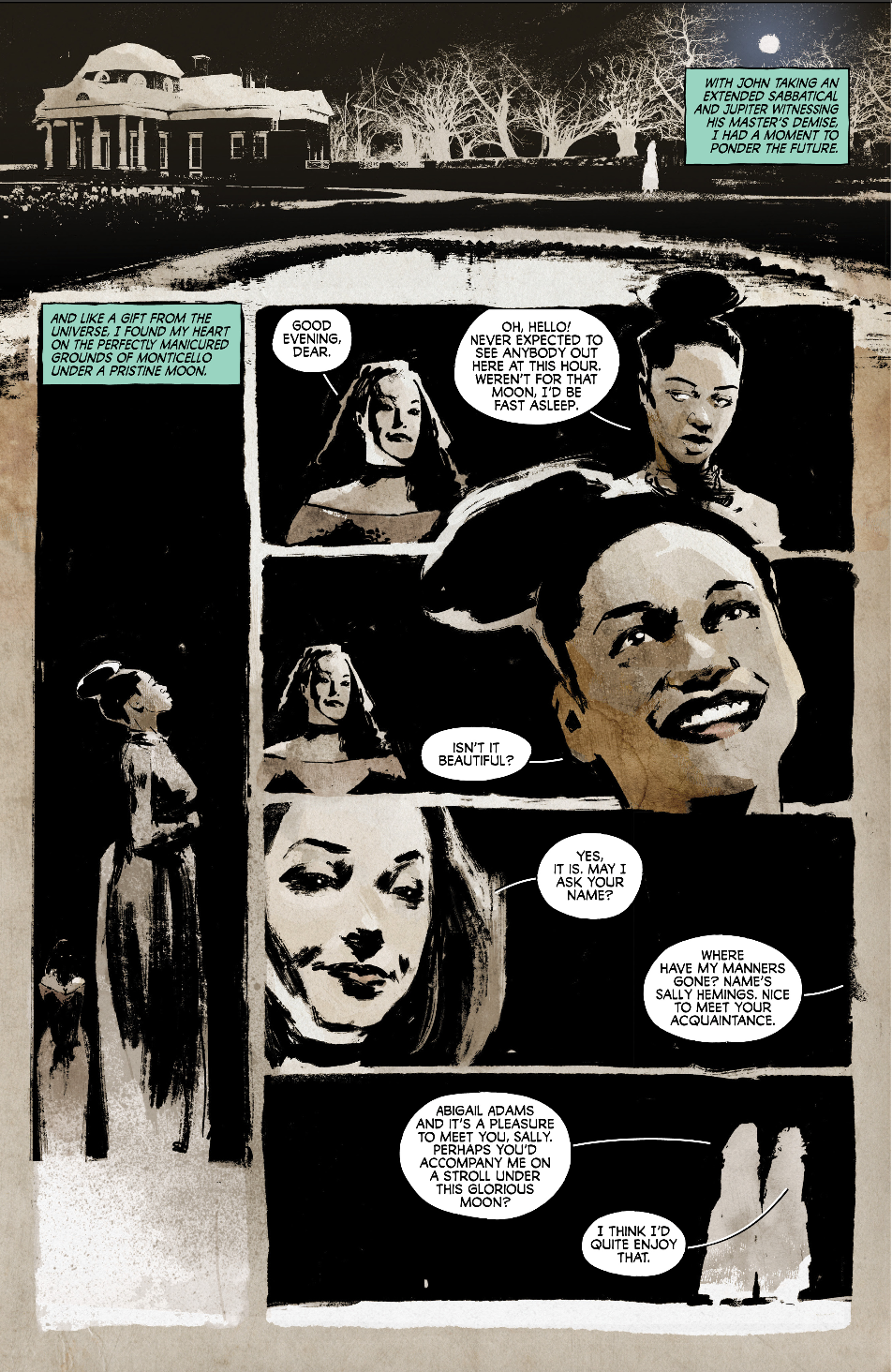When Abigail spurs Jupiter on to murder Jefferson, she walks around the grounds of Monticello and encounters Sally taking a nighttime stroll. When Abigail introduces us to Sally, we see Sally standing on the grounds, looking up at the sky. Abigail, at a distance behind Sally, haunts the panel. We see her in silhouette, her eyes the only part of face we see at that distance. Abigail describes seeing Sally as “a gift from the universe.” Abigail’s initial reference to Sally as “a gift” mirrors, in ways, Jefferson’s view of Sally as being an indulgence for his pleasure. Abigail begins by presenting Sally as someone who can benefit her and her feelings, thus centering herself and her whiteness in the process.