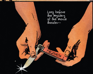 At the start of the second issue, Vee talks about the first time she met El. Vee was in the woods collecting leaves, and El was using a knife that her father gave her to carve things into trees. A skinless man attacks Vee, and El comes to her rescue, stabbing it in the back and scaring it off. El’s knife stands out in this sequence. In the third panel, we see El’s hands opening the pocketknife as Vee narrates, “Long before the mystery of the movie theater. . .” On the knife handle, we see the phrase “Toldyaso.” This image reinforces, even though we do not yet know what happened, the credibility of El’s story and her assumption that Josh assaulted her and Vee.
