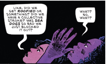 Over the first few issues of The Low, Low Woods, El tries to convince Vee that something happened to them in the theater, yet Vee refuses to even think about it, let alone acknowledge that something could have happened. Immediately after the event, as the ride home, El tries to figure out what happened. She asks if Josh, the theater employee, roofied them. Vee dismisses all of it, telling her friend that she needs to get home.