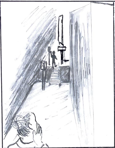 The third page shows the man and woman walking in different directons and the man finding the change purse. He picks it up and starts to follow the woman to rteurn it. The final panel on this page is interesting because as he stands at a crosswalk he narrates, “I pursued, hoping to catch up to her, but she was walking so quickly it was hard to keep up.” What stands out here is the use of “pursued,” a word that contains ominous connotations. When one pursues another person, we typically think about the pursuer having ill intent towards the person they are following. The narrator could have said, “I followed her” or merely “I tried to catch up to her,” but the use of “pursued” underscores the themes of the narrative and the woman’s unwarranted fears.