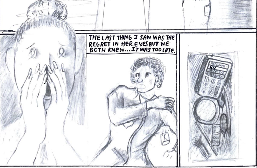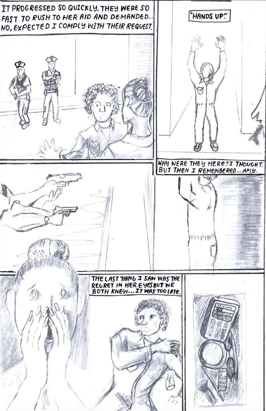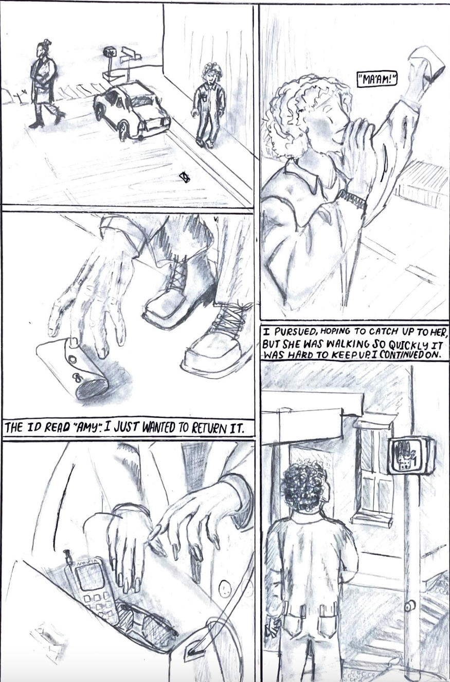 For the assignment, I gave students the option of collaborating with a peer. The product that two of my students constructed in a 5 page graphic narrative. The narrative takes place in 1995. We see a Black man talking on a pay phone with his wife, and as he steps out of the phone booth he accidentally hits a white woman, who is walking by, with the door. She drops the contents of her purse, and he helps her pick them up. The lady walks on, but the man realizes she left her change purse. So, he walks after her, trying to return her change purse. The woman sees him as a threat and calls the police. The police arrive and see the man approaching the woman. They draw their guns and shoot the man.