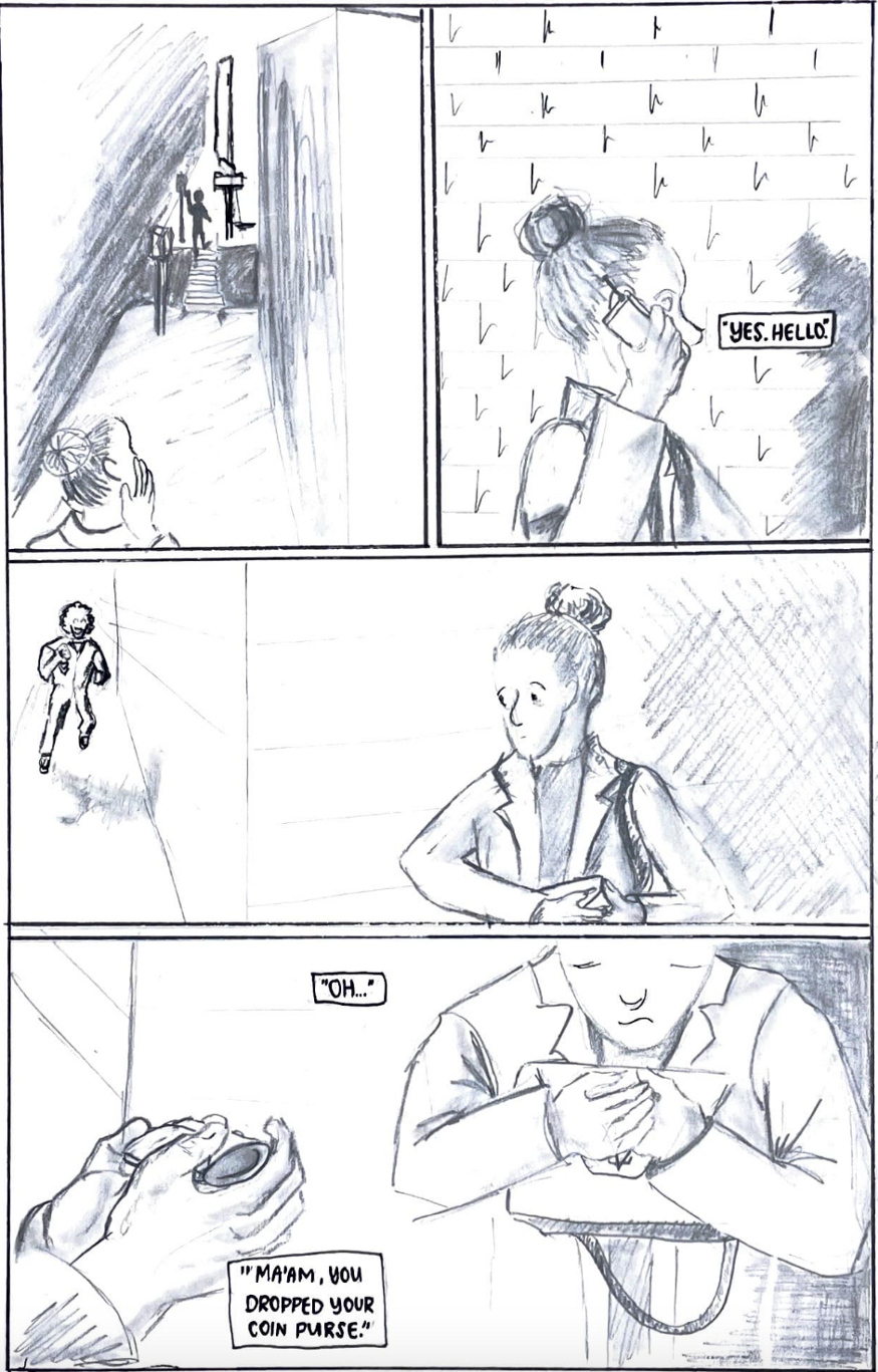 What makes the students’ project different from “Profile” and other texts we read during the course, is the way that they set it up. The five panels on the first page show the man in the phone booth talking with his wife and accidentally hitting the woman as he opens the door. We don’t see the man’s face or any features, apart from his hair in a kind of shilouette image in the second panel. Thus, we do not know, specifically, that he is a Black man. We just know he is a man. The second page begins with a panel showing the man’s hands as he picks up the contents of the woman’s purse, and the third theirs panel shows the man holding the contents as we see his hands and the bottom part of his face. In these panels, we see that he is a Black man, but we still don’t see all of his features. We see him from behind in the last two panels on the page. Thus, he doesn’t really exist for the woman. Instead, she views him not a person but as a threat. We see this when she abruptly turns away from the man after he returns her belongings.