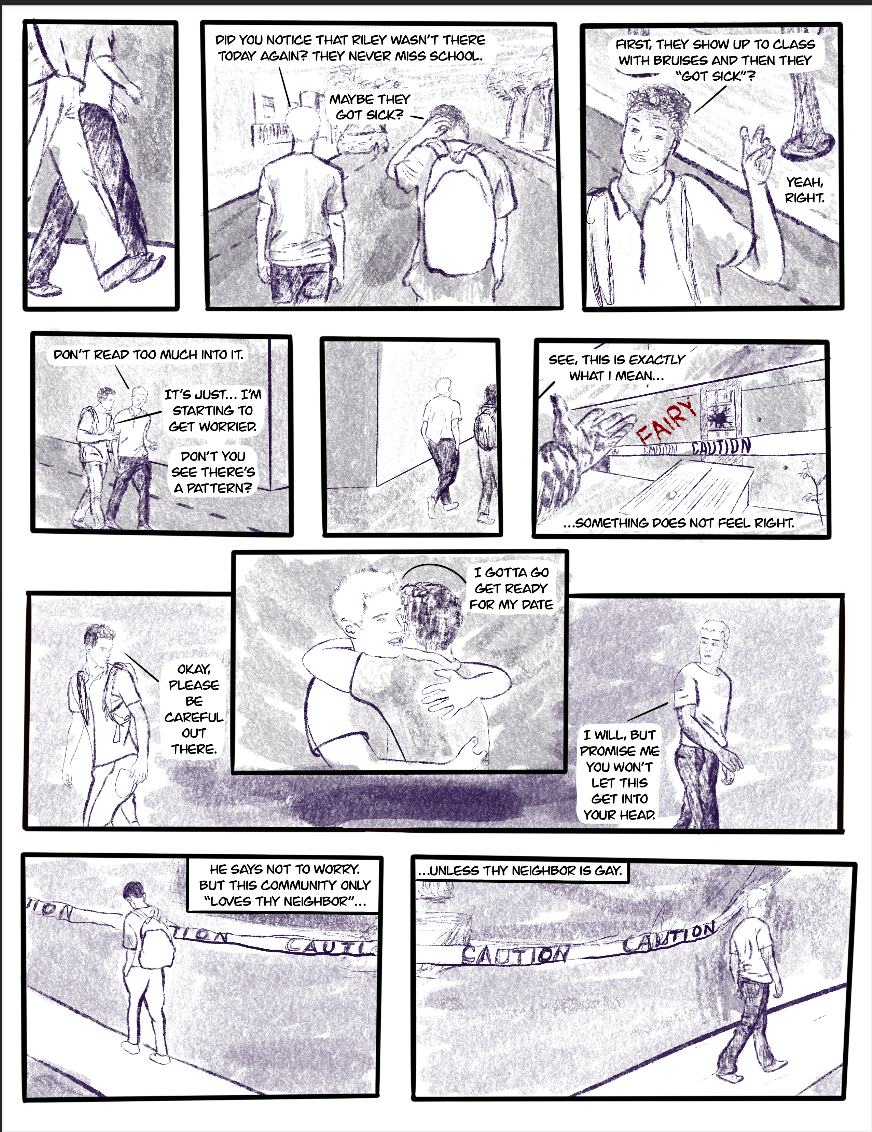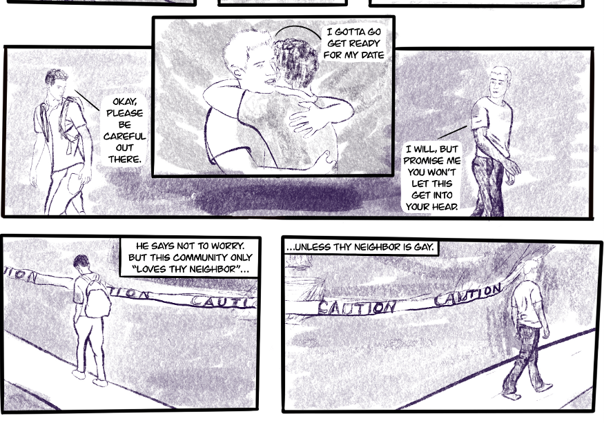 The next two panels have a gutter in between them. These panels mirror the first horizontal panel; however, the teens do not look back at one another and each walks off towards home, moving to the edges of the page. Behind each of the teens, as they walk down the sidewalk, we see caution tape, serving as a warning. The gutter separates them, creating a break between them and also hinting at something to come. The protagonist tells Gerard, in the earlier panels, to be careful, and Gerard tells the protagonist not to worry. In the split panel, the protagonist narrates to himself, “He says not to worry. But this community only ‘Loves thy neighbor,’ unless thy neighbor is gay.”