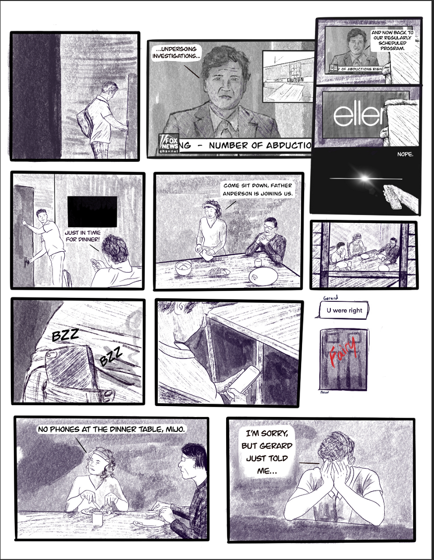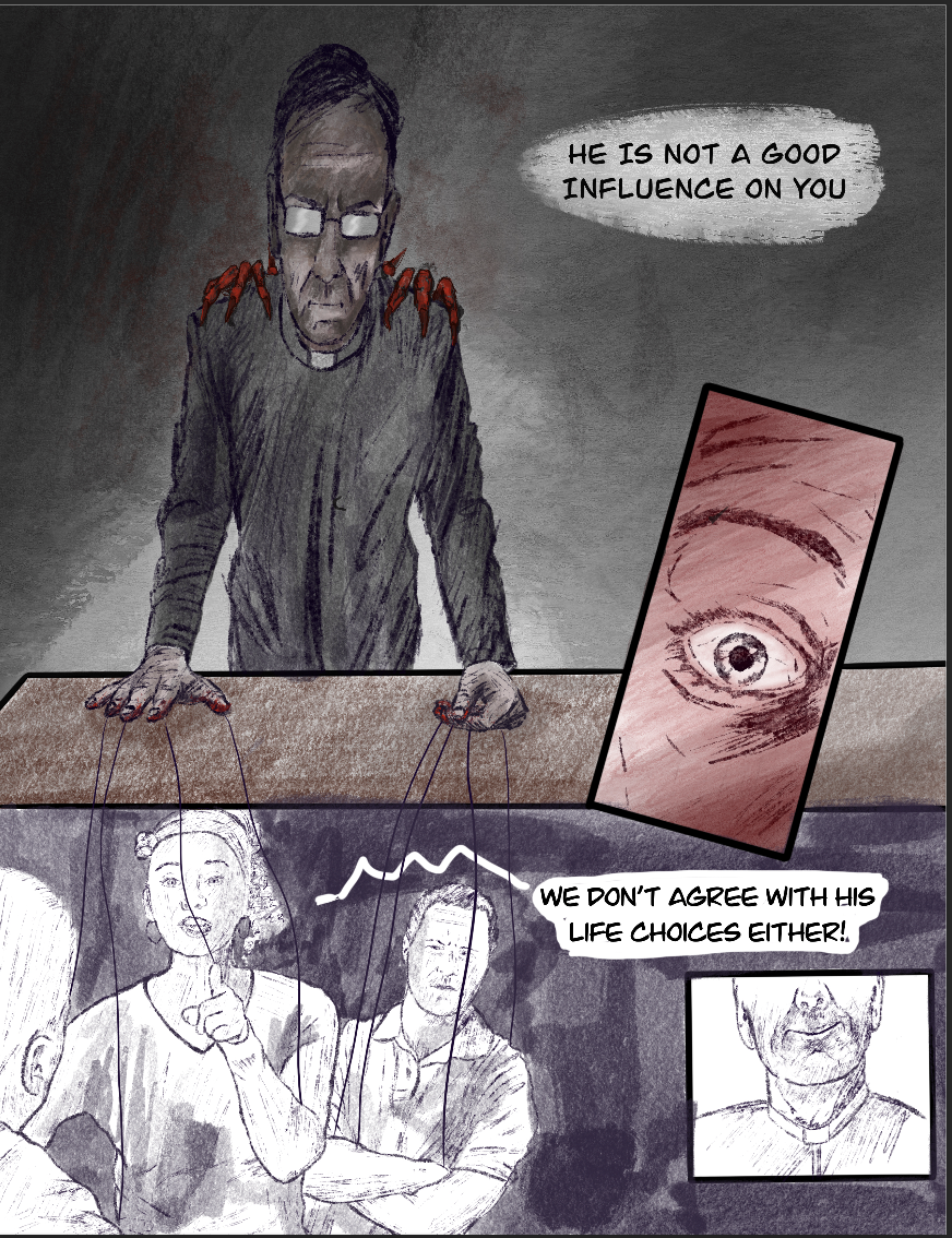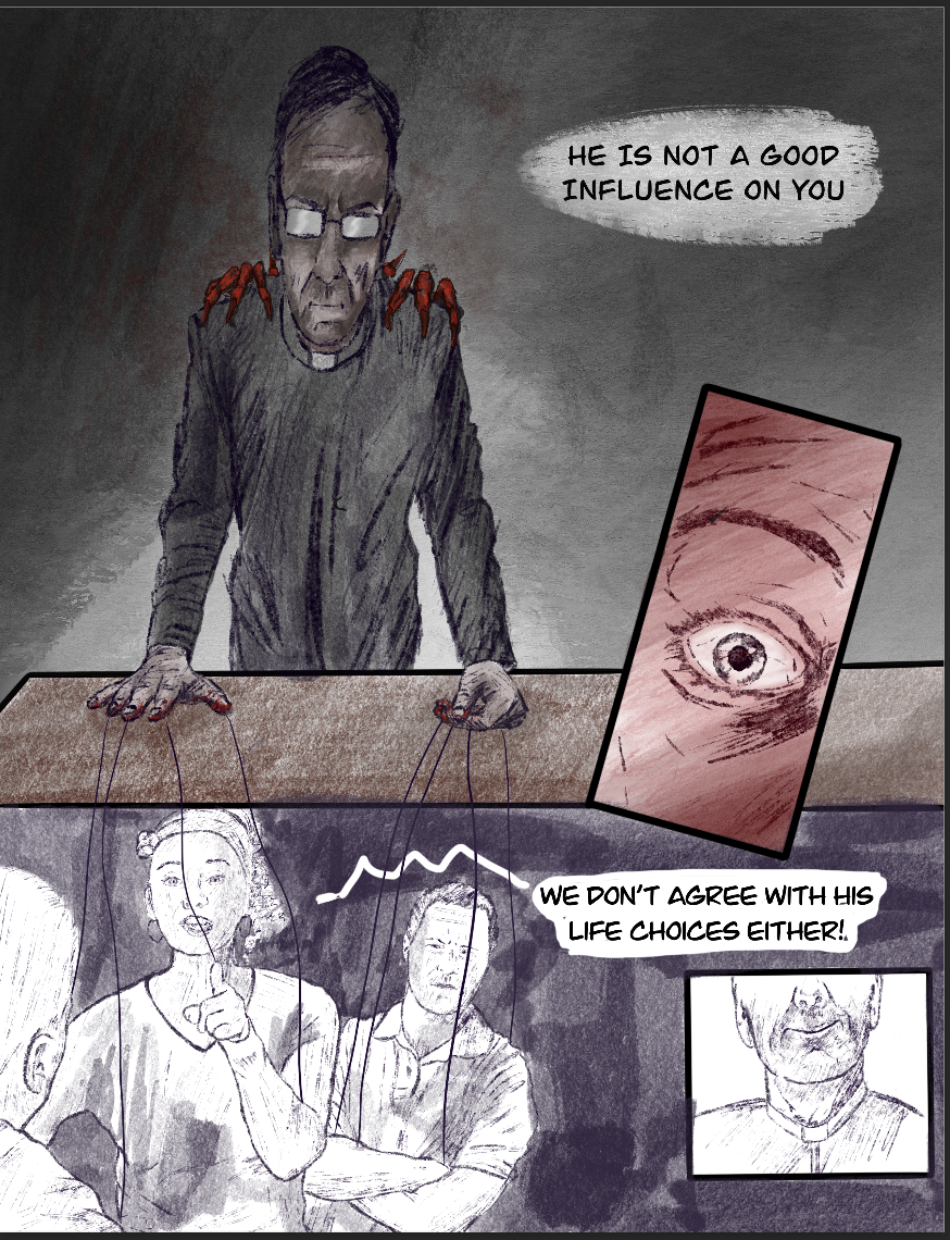 After the protagonist receives a text from Gerard, we see this control as Father Anderson stands up and places his hands on the table as we see the protagonist’s mother tell her son, “He is not a good influence on you.” In this panel Father Anderson glares at us. We do not see his eyes through his glasses, and we see what appear to be demonic hands on his shoulders and strings coming down from his fingers. The strings bleed into the next panel, attaching themselves to the parents as if controlling them like marionette dolls. The mother continues, “We don’t agree with his life choices either!” The page ends with a small insert panel showing Father Anderson face, from the nose down, with a smirk across his mouth. This page, in connection with the father turning the television off, drives home the ways that individuals allow institutions to control and manipulate them, falling in line behind rhetoric and believing in fears.