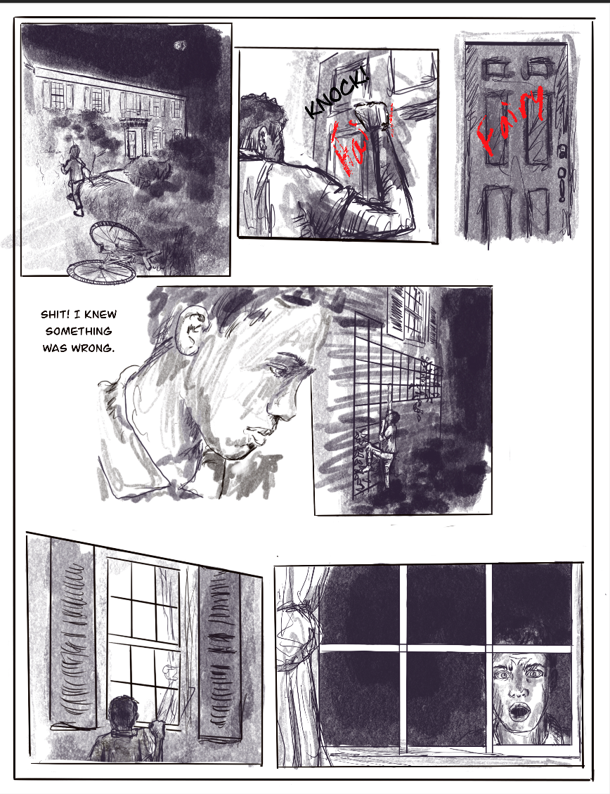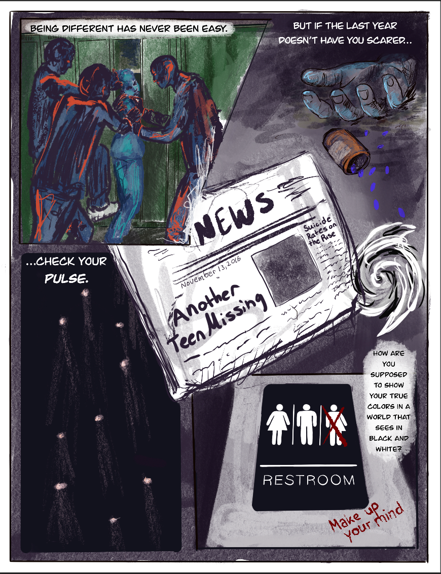 Over the past couple of posts, I’ve been writing about the Graphic Narrative/Script assignment I did in my “Monsters, Race, and Comics” class this semester. Today, I want to continue that topic by looking at another student crated project. Like the previous project that I wrote about last post, this project floored me. When I initially read it, I saw the influence of Rodney Barnes and Jason Shawn Alexander’s work, specifically Nita Hawes Nightmare Blog, as well as Pornask Pichetshote and Aaron Campbell’s Infidel and other works. However, when the students presented their product to the class, they discussed so much more, relaying all of the allusions contained within the comic, notably songs such as Kendrick Lamar’s “Auntie Diaries” and references to Cyndi Lauper’s True Colors Fund. I could do a whole post on all of these that they mentioned; instead, though, I want to take some time a look at some specific moments in the product that really stood out to me when I initially read it.