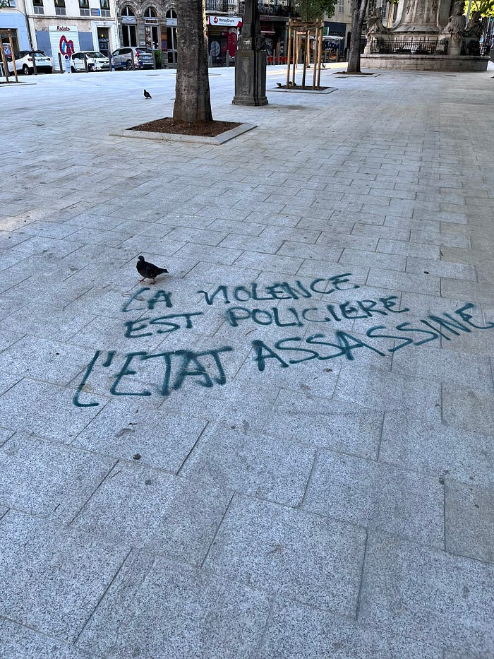 While I roam, I keep my eyes open for things around me, for signs and indications to tell me about the area where I am roaming. Being observant, for me, is a key aspect of roaming because when one roams one must be aware of their surroundings, and through observation one learns about the people and area. During my time in Marseille, I went out early one morning to walk around the city and came across some graffiti on the ground. It read, “La violence est policiere l’etat assassine.” A few weeks after our return to the United States, the protests following the murder of Nahel Merzouk took place in France, and the images I saw on news reports showed protests in Paris and Marseille. While I knew the history of Marseille before my trip and the protests, seeing the graffiti drove home why protests in Marseille took place over the murder of Merzouk and not, at least on the same level, over the raising of the retirement age.