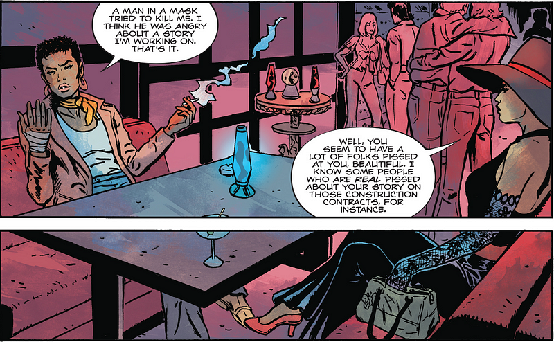 In this panel, Abbott tells Amelia about the man who tried to kill her, and Amelia responds, “Well, you seem to have a lot of folks pissed at you, beautiful. I know some people who are real pissed about your story on the construction contracts for instance.” Paying close attention to Amelia’s words, we notice that she calls Abbott “beautiful.” This could just be a rhetorical ploy, a condescending comment to a reporter who has “pissed” off some people connected with Amelia. However, in the bottom panel, the one where the gutter bisects the image, we see Abbott’s and Amelia’s feet touching in an intimate manner, a familiarity that suggests a past relationship. The words appear in the surface, for the public around them, but the intimacy is underneath the table, for them and us as readers. This tension, the intimacy between the two and the outward animosity, runs throughout the book. The gutter serves to show us this disconnect, these different aspects of their relationship.
