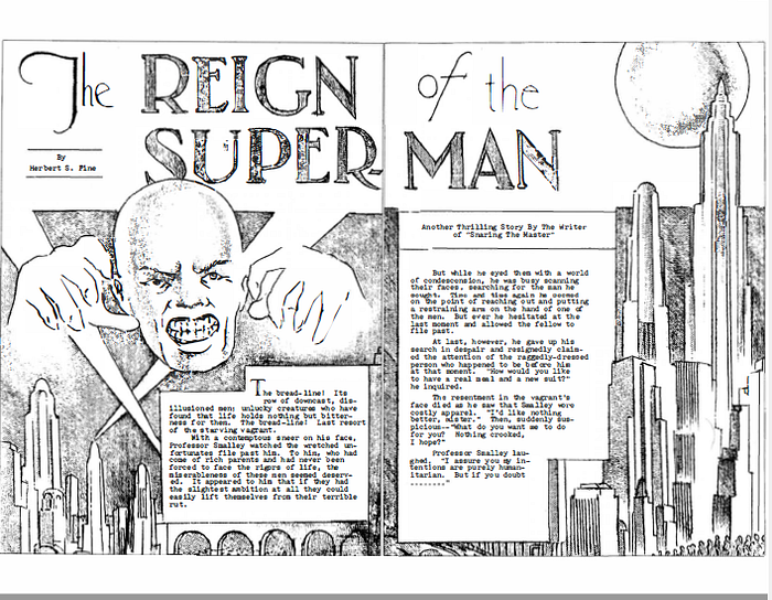 “The Reign of the Superman” is, at its core, a story that speaks to the historical moment of the Great Depression, economic insecurity, fears of modernity, and fears of global conflict, among other things. The first paragraph foregrounds these issues when the narrator states, “The bread-line! Its row of downcast, disillusioned men; unlucky creatures who have found that life holds nothing but bitterness for them. The bread-line! The last resort of the starving vagrant.” Professor Smalley, a chemist who has acquired fragments of a meteor, stalks the bread-line looking for a subject to test a concoction he made from the meteor to see the effects before using the substance on himself. It is here that he comes across William Dunn and uses Dunn as a lab rat for his experiment. Smalley views the individuals in the bread-line negatively, saying that their poverty stems from their lack of motivation to work because even “if they had the slightest ambition at all they could easily lift themselves from their terrible rut.” He plays into the myth of the American Dream, and through his role as a chemist, also, as Regaldo writes, “represents modern scientific rationalism.”