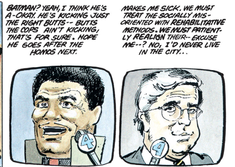 Miller uses “fascist,” in varying contexts, throughout The Dark Knight Returns, sometimes referring to Batman himself and sometimes to other individuals. This makes it unclear who is fascist and who isn’t. This uncertainty comes from the fact that The Dark Knight Returns uses news reports, debates, and interviews to move the story forward, thus having individuals on every side use the term fascist. If we take fascism, at its core, to be the embodiment of fear and supposed decline of a nation and “traditional” values, then The Dark Knight Returns contains fascism through the narrative of Gotham being overrun by crime, fueled in part by the media, without any real move towards alleviating it except through vigilante justice. The people feel they must become the “hero.”