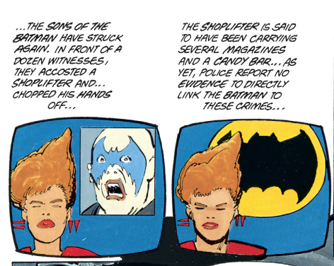 The media’s role in role in relation to fascism appears when we learn that a media blackout occurs whenever Superman does something sanctioned by the president at the governemnt but any act committed by Batman gets reported. This control of the media, this use of the media to push a certain narrative, pitting one side against the other, is a fascist tool. As well, the use of Superman in service to the government is, in and of itself, fascistic. This is where the conundrum comes in when looking at The Dark Knight Returns. Which character represents facsim? Does either character? I’d say it’s a mixture because Batman’s organizing and rallying of the Sons of Batman reeks of fascism, and Superman’s role as an agent of the governemnt reeks of fascism. Add on top of all of this the role of the media and The Dark Knight Returns becomes a convoluted mess.