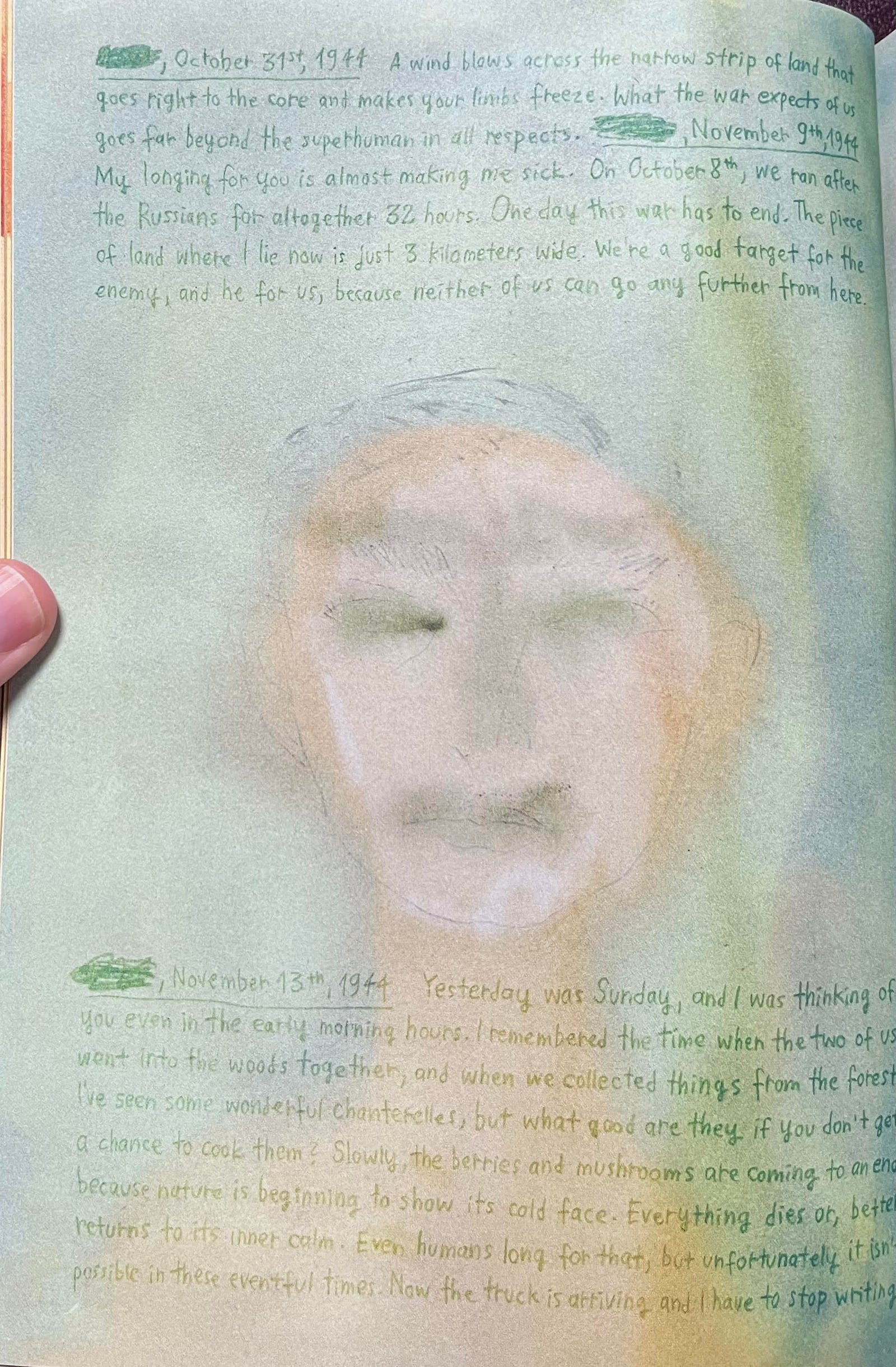 At one point, Krug receives a package which contains letters from Edwin, her grandfather Willi’s brother, to his wife Elsa. Edwin writes to Elsa about his loneliness and missing her and his family. They are, as Krug writes, “adorned with drawings and pressed leaves and flowers, with place names censored by the military, sent from what he describes as the land of ‘fathomless forests, swamps, and steppes,’ [and they] chronicle nothing but his gradual emotional disintegration.”