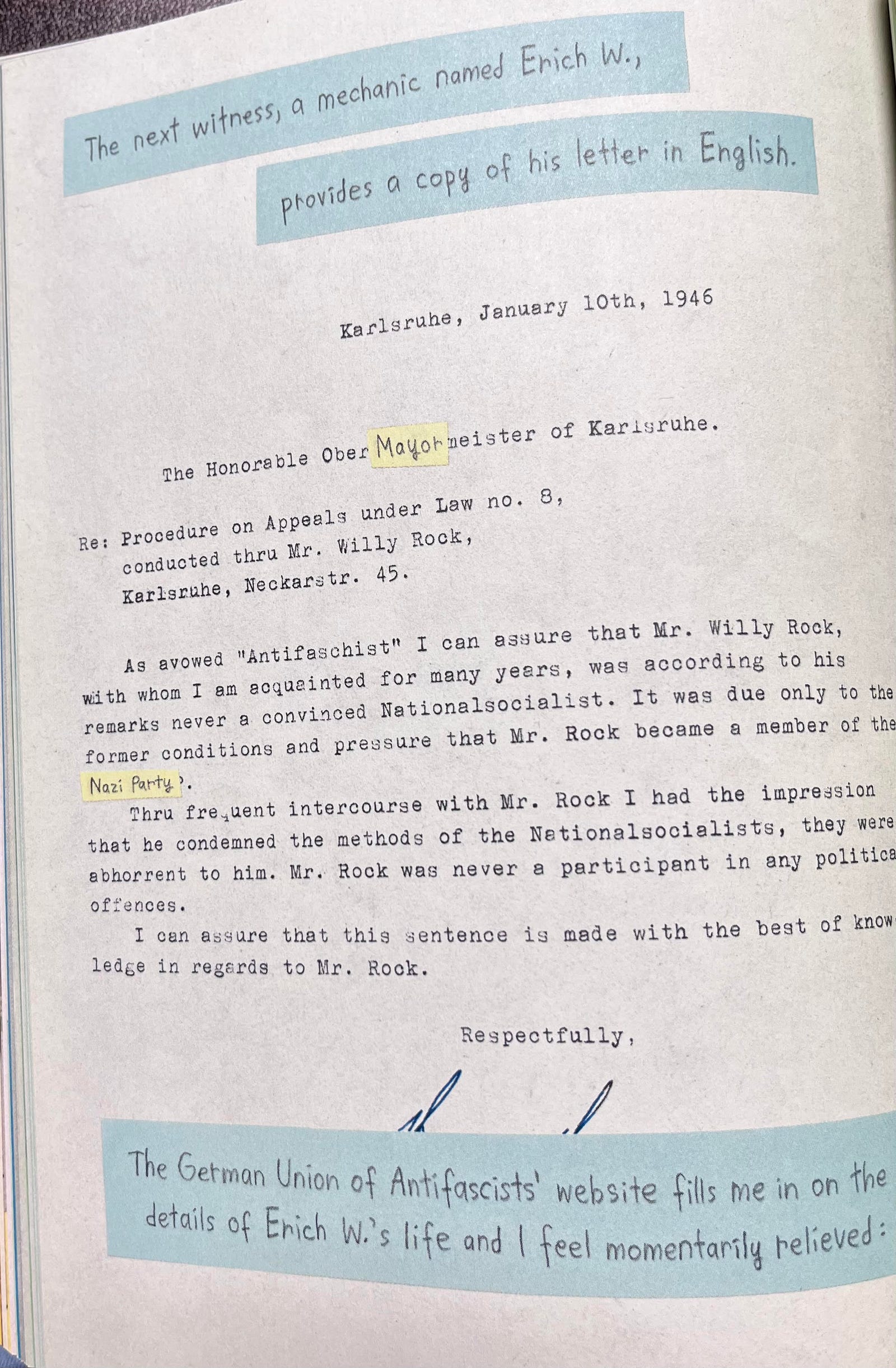 Krug’s journey to discover her grandfather Willi’s role in all of this highlights this ambiguity because he did not, it seems, adhere to Nazi ideology, yet he participated in the Wehrmacht to ensure the safety of his family and himself. After the war, the Allied troops deem Willi an “offender,” one step below the most notorious “major offender.” Krug, reading through the archives, sees the struggle Willi goes through to show that he was a mitläufer not an “offender.” There are countless letters, from the mayor of Karlsruhe to a letter from an “avowed ‘Antifaschist’” Erich W. to a letter from Albert W. whose wife was Jewish. Willi’s plight from “offender” to mitläufer drives home the humanness of his experience and the humanness of others’ experiences.