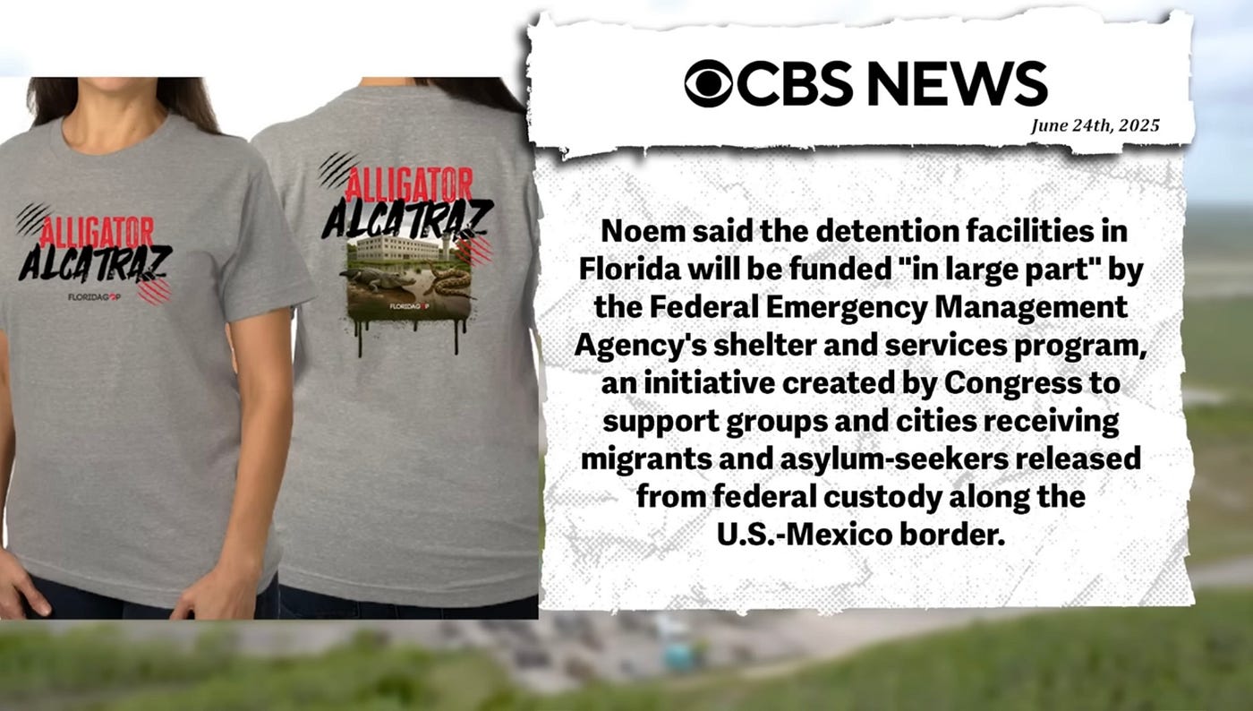 I thought about this shirt when I started seeing news about “Alligator Alcatraz” in Florida, a detention center in the Everglades that can hold 3,000 detainees. Funded by FEMA funds, the concentration camp, there is no other name for it, came together in a little over a week, situated in a region ravaged by extreme heat, flooding, hurricanes, and more. In fact, flooding has already occurred, and lawmakers who have sought to visit the site have been denied entry. As well, the facility costs $450 million a year to operate, and, CBS Miami points out that the some GOP donors will profit off of the facility through government contracts.