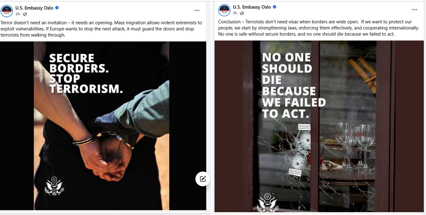 I know this tactic. I’ve seen it countless times. Lillian Smith knew this tactic with the Jim Crow South and demagogues. She wrote, “The Devil knows that if you want to destroy a man, all you need do is fill him with false hopes and false fears. These will blind him to his new direction and he will inevitably turn away from the future and destroy himself and those close to him.” The false fear has been a non-existent invasion of rapists and criminals from Mexico and elsewhere, a fear stoked from Trump’s first utterances when he descended the escalator in 2015. It’s one that continues today, reaching outwards even from the United States to our embassies in places like Norway with posts such as the ones below. What the US Embassy in Oslo doesn’t note, though, is that the deadliest terrorist attack in Norway occurred on July 22, 2011, when avowed white supremacist Anders Breivik murdered 77 and injured 300 people, mostly teenagers at a Workers’ Youth League summer camp. Breivik, in turn, inspired domestic terrorists in the United States such as Adam Lanza who committed the Sandy Hook Elementary School shooting in 2012 and possibly others such as Robert Gregory Bowers who killed 11 and injured 6 people at the Tree of Life Synagogue in Pittsburgh.