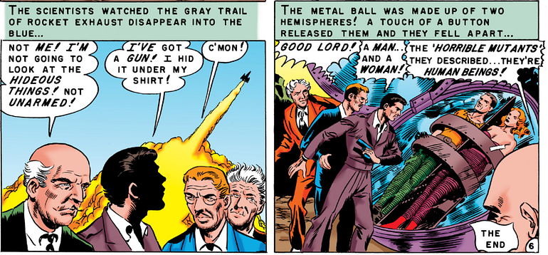 If we look back at the story, we discover that the doctor’s description of the “mutants” simply describes humans. He describes our faces, our eyes, our noses, our bodies, our arms, our legs, our hands, our feet, our nails. He describes how we sweat from our skin. The following panels describe how we eat meat, our negative emotions, how we treat one another, and more. We can read these aspects in two ways. On one hand, we can read them in racial terms, as if the “mutants” are non-whites and the reveal at the end highlights our shared huamnity, even though the man and woman in the capsule are white. I say this because like “The Green Thing,” this story appears before “Judgment Day!” If we read it in light of “Judgment Day!,” it carries a similar plot, only without the reveal of the visitors being Black.
