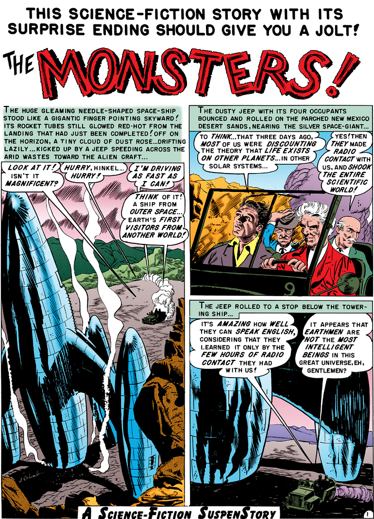 Over the past few weeks, I’ve written about a few of the stories from EC Comic’s Weird Fantasy series in relation to race. I noted how “The Green Thing” addresses the racist trope of contagion and of tainted blood, and I discussed how “Counter-Clockwise” uses positioing to place the white reader in the position of those that they discriminate against. Today, I want to continue this thread by looking at another science fiction story in Shock SuspenStories #1, a series that EC started to showcase the various types of comics they produced. Each issue contained a horror story, a war story, a crime story, and a science fiction story. “The Monsters!” appeared in the first issue from February and March 1952, almost exactly one year before the monumental story “Judgement Day!” in Weird Fantasy #18.