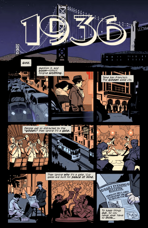 The first three pages of The Good Asian serve as a primer in the power of sequential art to tell and story and to engage readers. The opening page contains a long horizontal panel at the top that proclaims “1936” in the middle with an image of the Golden Gate Bridge and Alcatraz depicted in the panel. The lone narration reads, “Gold.” From the outset, we know the year and the place the narrative takes place, and the use of “Gold” centers us in that place, bringing to mind the history of the Gold Rush in California and also the bridge itself. The rest of the page contains nine panels, laid out in a three by three sequence, with the narration moving through the panels. We see cars lined up on a street, a couple walking to a club as crowds wait outside, performers and dances inside the Jade Castle, a streetcar, and a man reading paper as he gets his shoes shined. The final panel zooms in on the man’s paper, and the headline reads, “GERMANY DECLARES MANDATORY DRAFT TO HITLER YOUTH.”