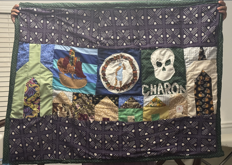 Finally, a student used her crafting skills to make a quilt based on S.A. Cosby’s All the Sinners Bleed. The student added so many parts to teh quilt from the Virginia state flag and the colonist’s boat to the skull representing all of the violence and death in Charon County’s history to Titus and Albert Crown’s house surrounding by the rest of the community to the two churches in the community, Jamal Addison’s new church and the older Black church where Albert attends. The student chose to do this because they craft, but also because of the history of quilting in the African American community from quilts being used as maps for the Underground Railroad to items that link families together across generations. The student chose to make the quilt out a pari of overalls and chose to add cowrie shells in order to represent charms used by African Americans to resist enslavement.