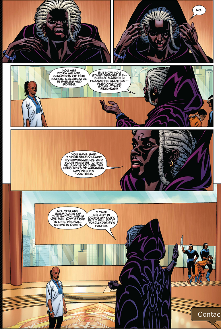 While Ayo pleads to Queen Ramonda for Aneka’s life. the queen listens, intently. Ayon begs the queen, Spare her, mother. Spare her the bastard sanction of men whose honor is ostentation, whose justice is deceit.” Ayo points out that the chieftain flouted his wealth and power, his ability to escape justice for his actions. Due to his wealth and his gender, the powers that be failed to act and punish him for his abuse, and since the powers did not act, Aneka did. To Ayo’s pleas, Ramonda says, “No.” She goes on to tell Ayon, “You have said it yourself: villainy overwhelms us. And your answer to this villainy is to turn the upholders of Waknadan law into its flouters.” The queen essentially tells Ayo that since her and Aneka, as part of the Dora Milaje, must uphold Wakandan law, Aneka’s actions do nothing but flout it, making them above the law just as the chieftain ostentatiousness and deceitfulness.