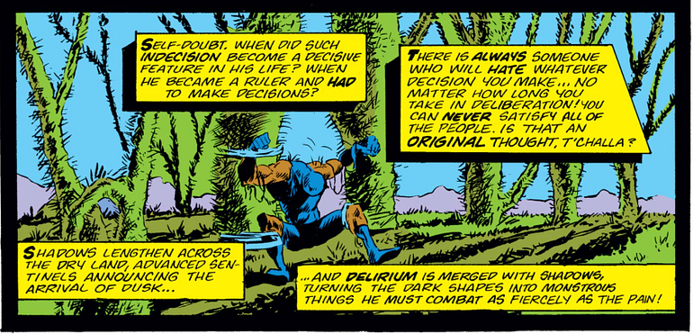 As he struggles to escape, the narrator peers into T’Challa’s psyche, giving us insight into the struggles he endures as the one who sits on the Wakandan throne. The narrator asks, “Self-doubt, when did such indecision feature in his life? When he became a ruler and had to make decisons? There is always someone who will hate whatever decision you make . . . no matter how long you take in deliberation! You can never satisfy all the people.” This moment epitomizes so much of what a thoughtful leader endures when making deicions that will impact those around them. No matter how long the individuals deliberates, some will not be satisfied, even if the decision ultimately benefits them and makes their lives better.