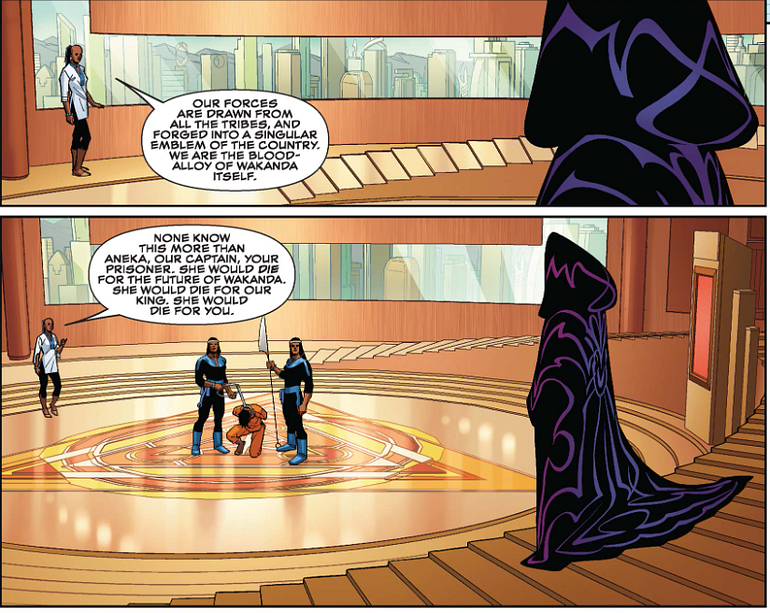 Even though Aneka is a Dora Milaje and, as Ayo says, thus embodies “the nation,” she has been condemned to die because she went outside the “law” and murdered a chieftain who had been abusing women. Ayo tells Queen Ramonda, “The chieftains outrages upon the girls of his village were known. Yet his lechery was unopposed. Aneka spoke to him as fathers and brothers should have spoken long before. And when she was not heeded, she did as the honor of Wakandan fathers and brothers always demanded.” Before she even killed the chieftain, Aneka spoke with him, as the men in his life should have, about his abuse of the girls and women in his village, but he did not listen. At this, Aneka enacted justice against the man, executing him for his crimes, and thus condemning herself to death.